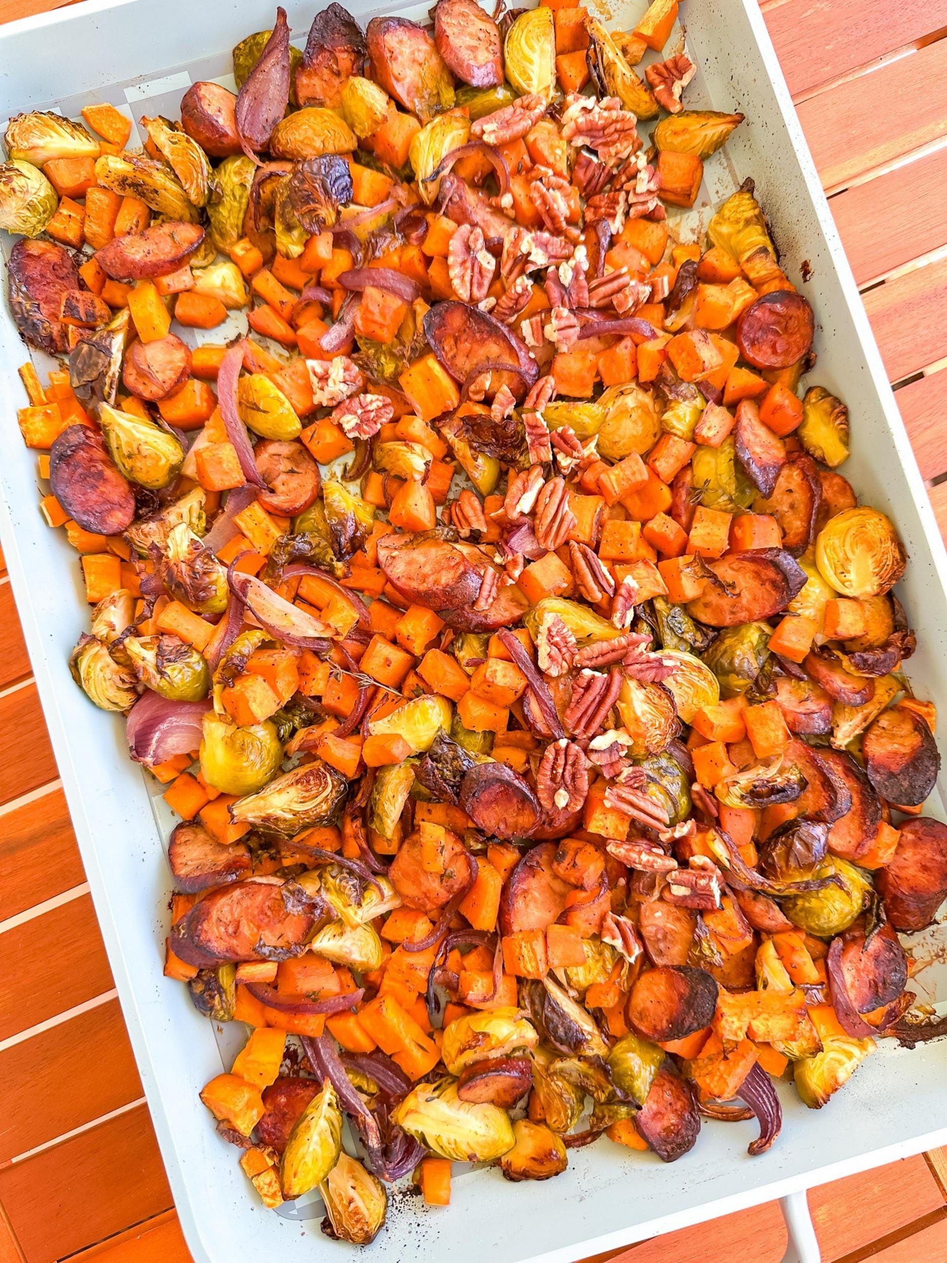 This is one of those throw everything on a pan and walk away meals. It’s cozy, a little sweet, a little savory, and perfect for busy nights.